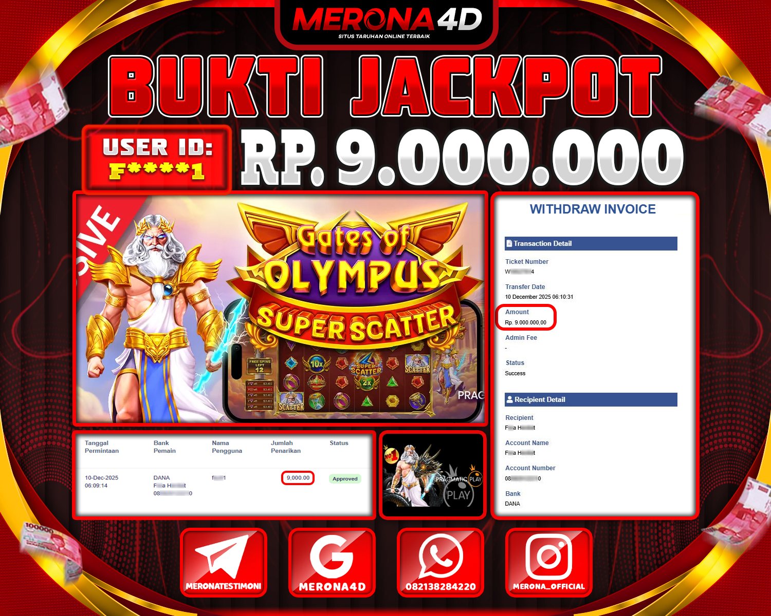 Selamat Kepada Member MERONA4D F****1 Telah Jackpot Di GATES OF OLYMPUS SUPER SCATTER