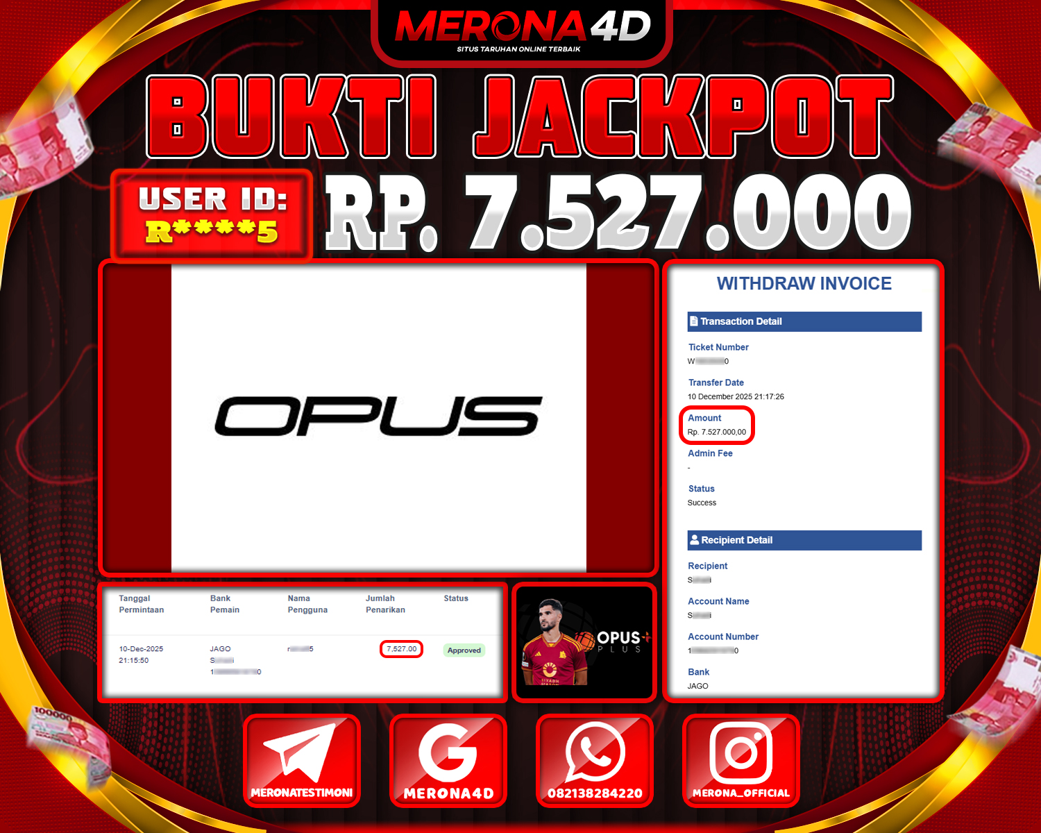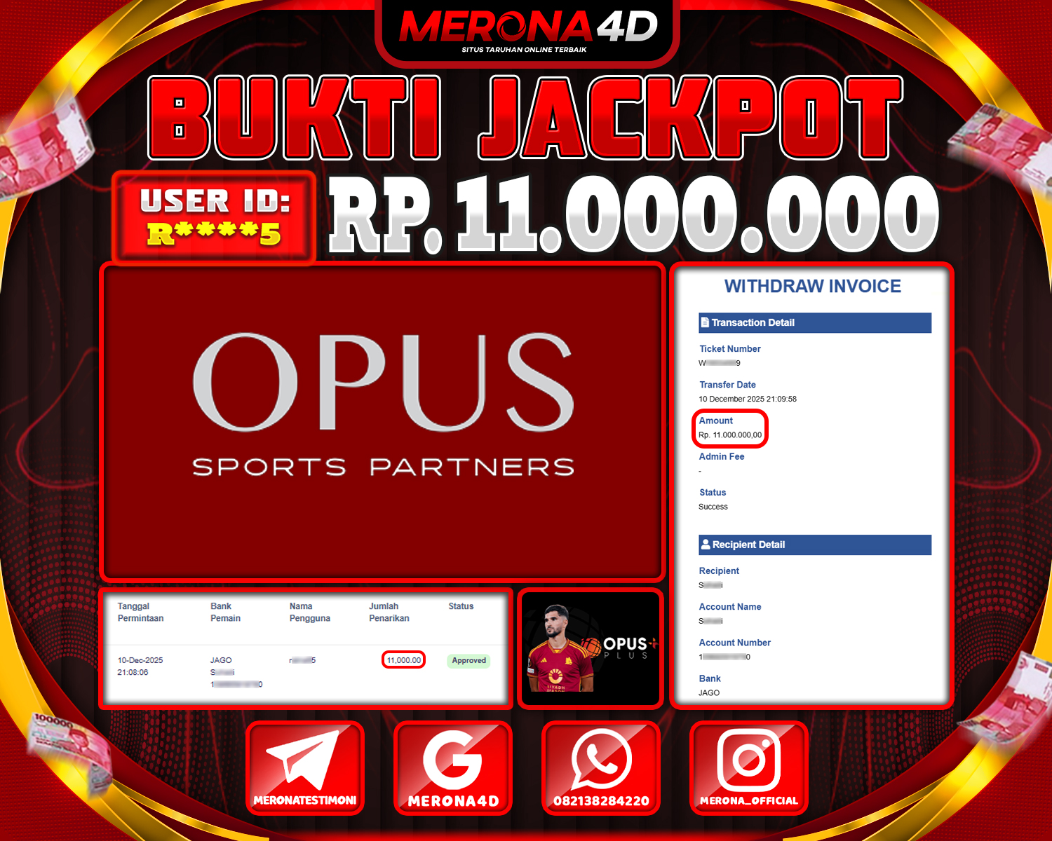 Selamat Kepada Member MERONA4D R****5 Telah Jackpot Di OPUS SPORBOOK