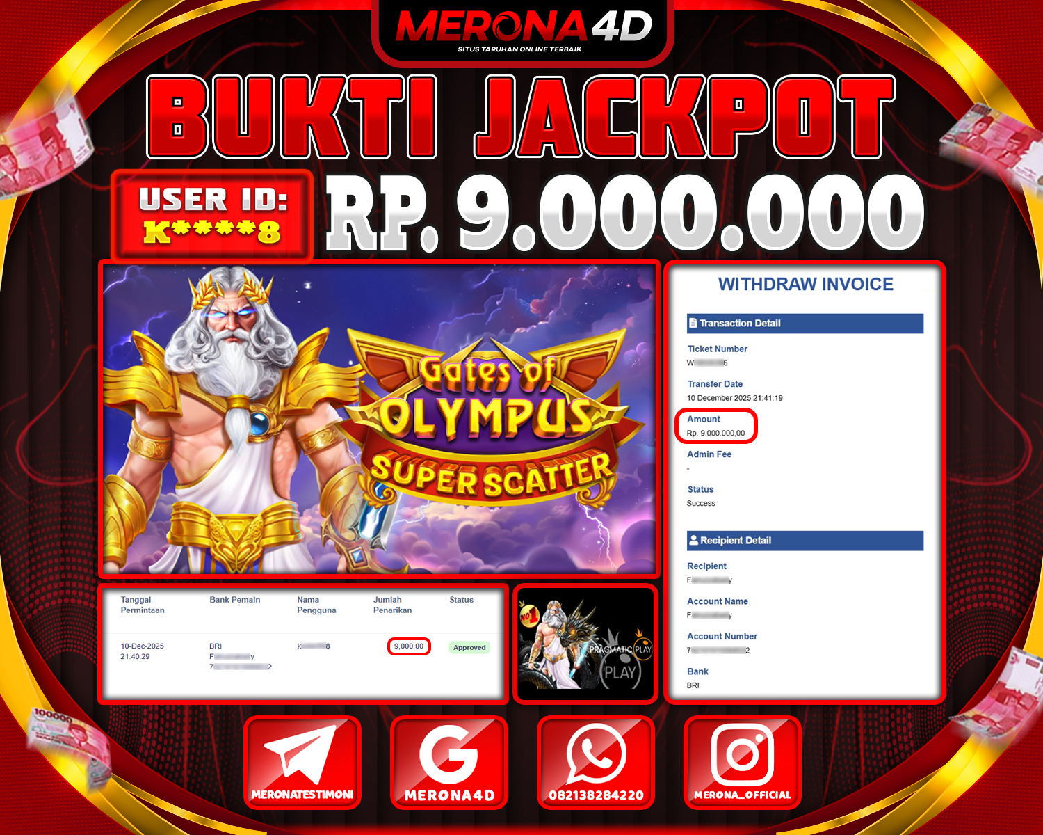 Selamat Kepada Member MERONA4D K****8 Telah Jackpot Di GATES OF OLYMPUS SUPER SCATTER
