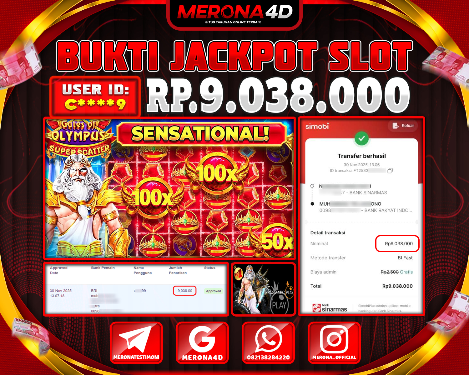 Selamat Kepada Member MERONA4D C****9 Telah Jackpot Di GATES OF OLYMPUS SUPER SCATTER