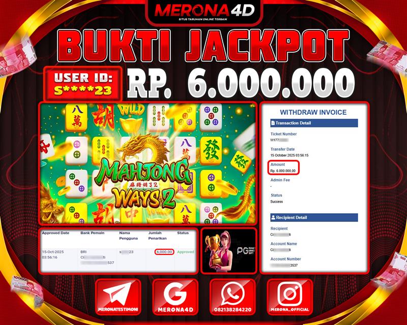 Selamat Kepada Member MERONA4D S*****23 Telah Jackpot Di MAHJONG WAYS 2