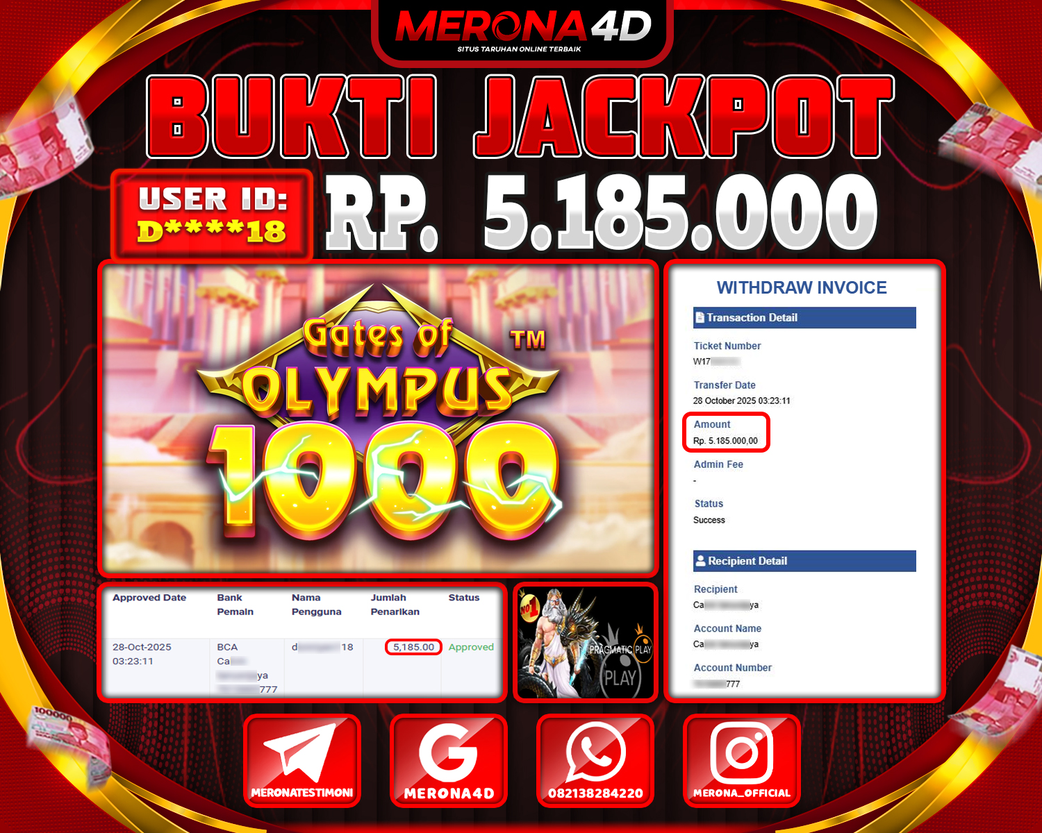 Selamat Kepada Member MERONA4D D*****18 Telah Jackpot Di GATES OF OLYMPUS 1000