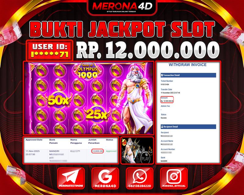 Selamat Kepada Member MERONA4D I*****71 Telah Jackpot Di GATES OF OLYMPUS 1000