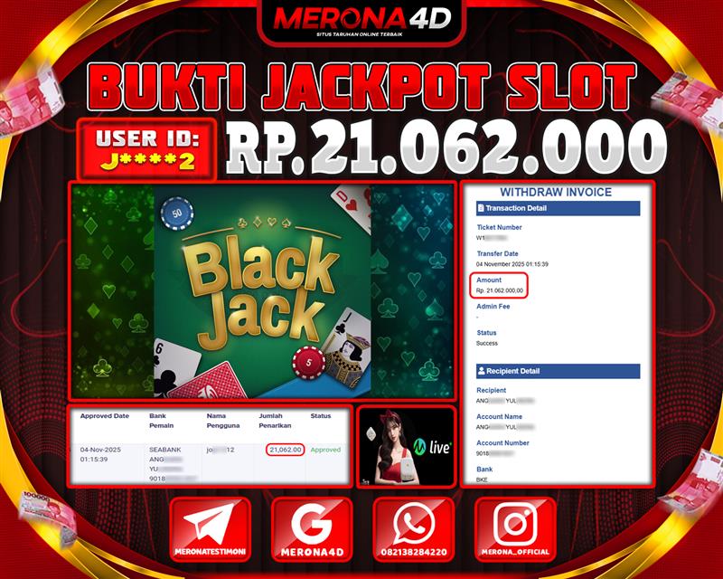 Selamat Kepada Member MERONA4D J*****2 Telah Jackpot Di BLACKJACKRIGA