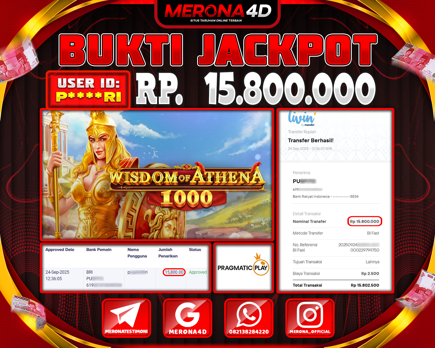 Selamat Kepada Member MERONA4D P*****I Telah Jackpot Di WISDOM OF ATHENA 1000