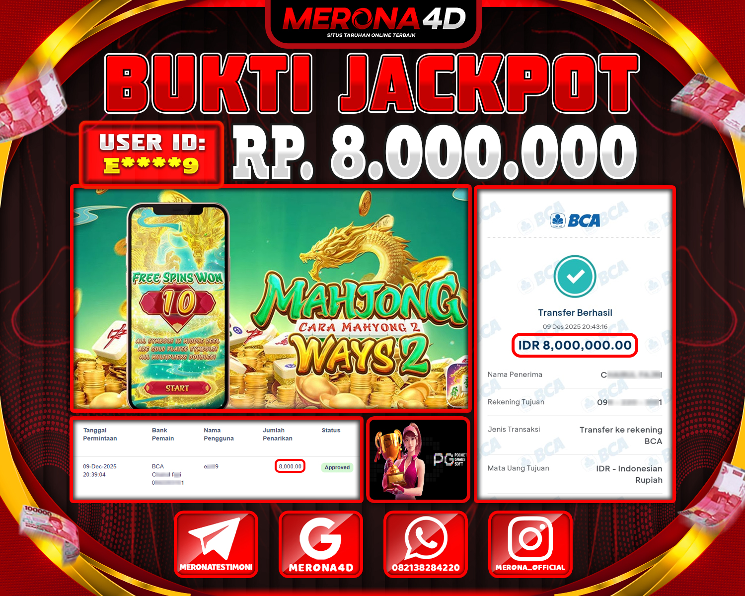 Selamat Kepada Member MERONA4D E****9 Telah Jackpot Di MAHJONG WAYS 2