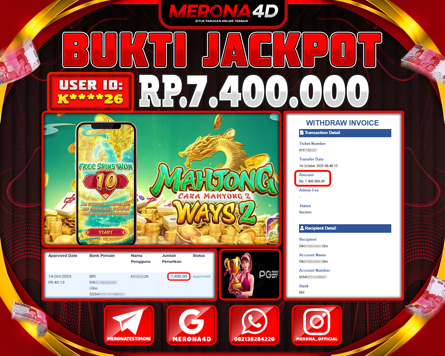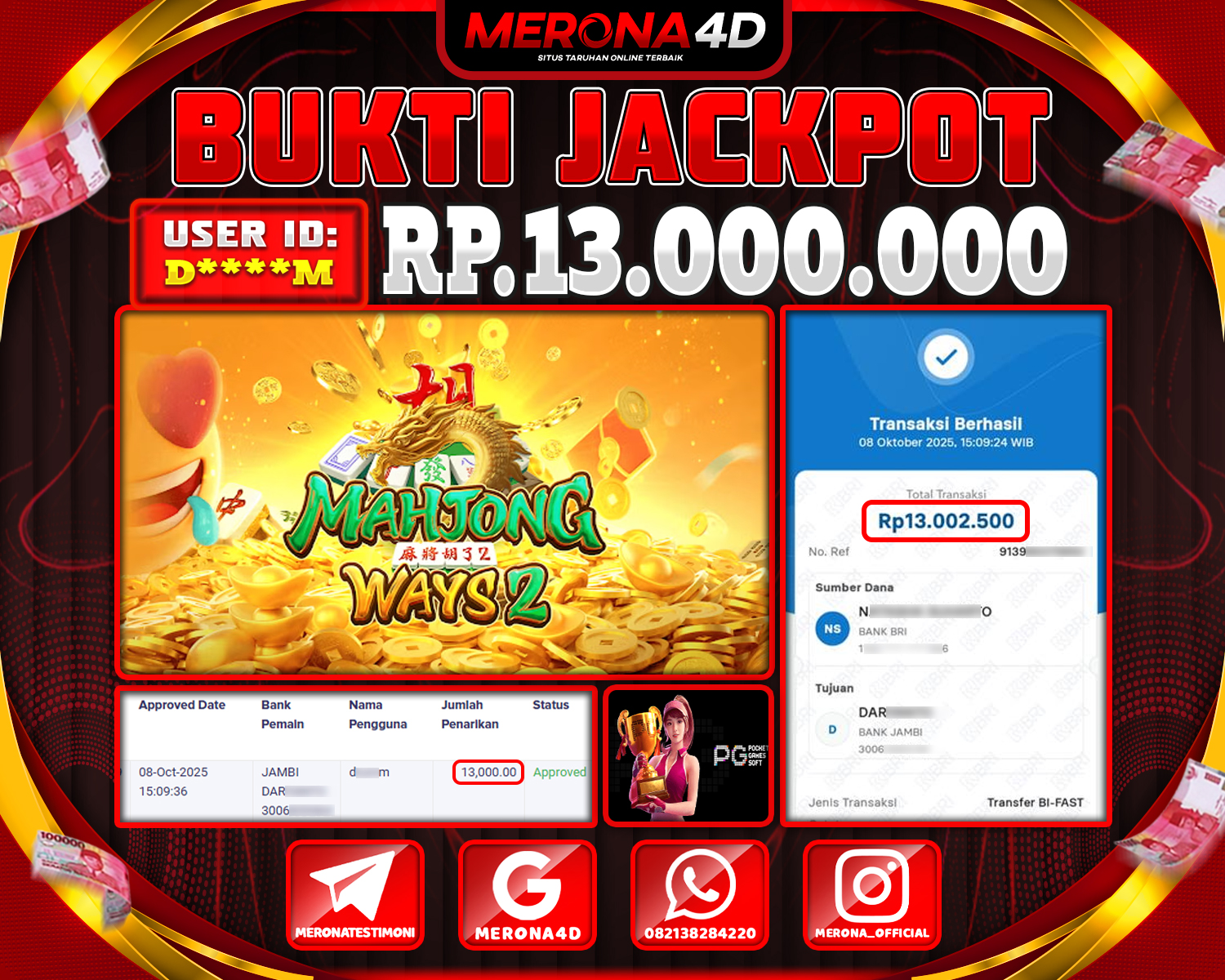 Selamat Kepada Member MERONA4D B*****3 Telah Jackpot Di MAHJONG WAYS 2