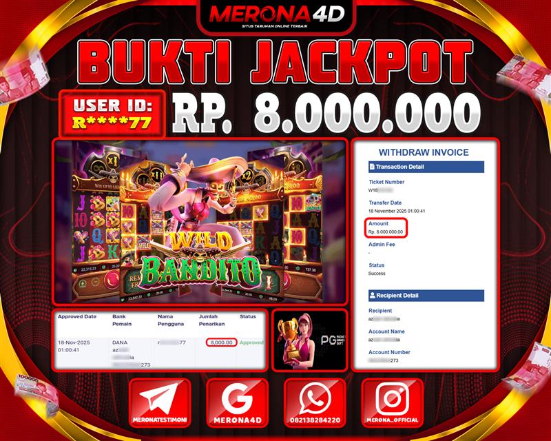 Selamat Kepada Member MERONA4D R*****77 Telah Jackpot Di WILD BANDITO