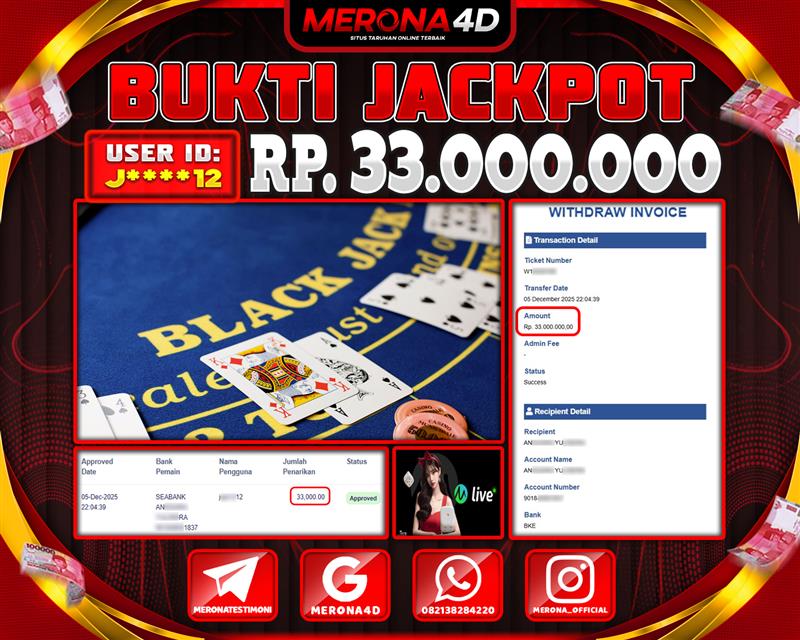 Selamat Kepada Member MERONA4D J*****12 Telah Jackpot Di BLACKJACKRIGA