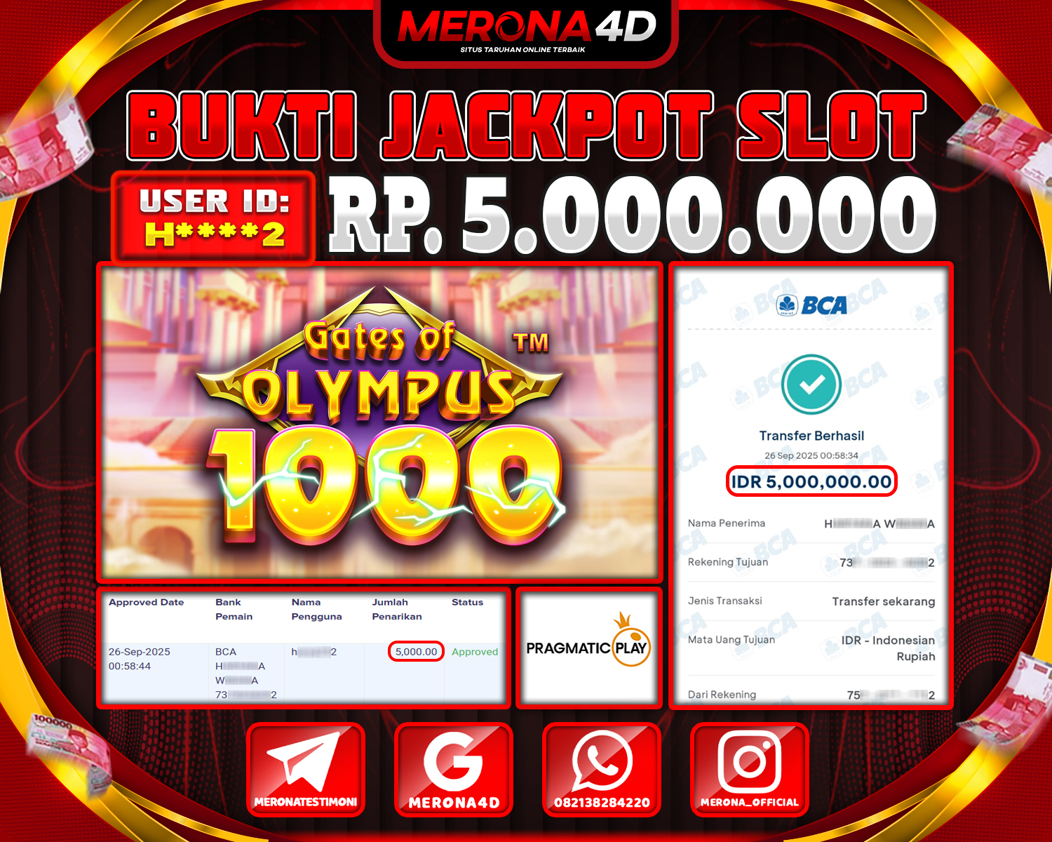 Selamat Kepada Member MERONA4D H****2 Telah Jackpot Di GATES OF OLYMPUS 1000