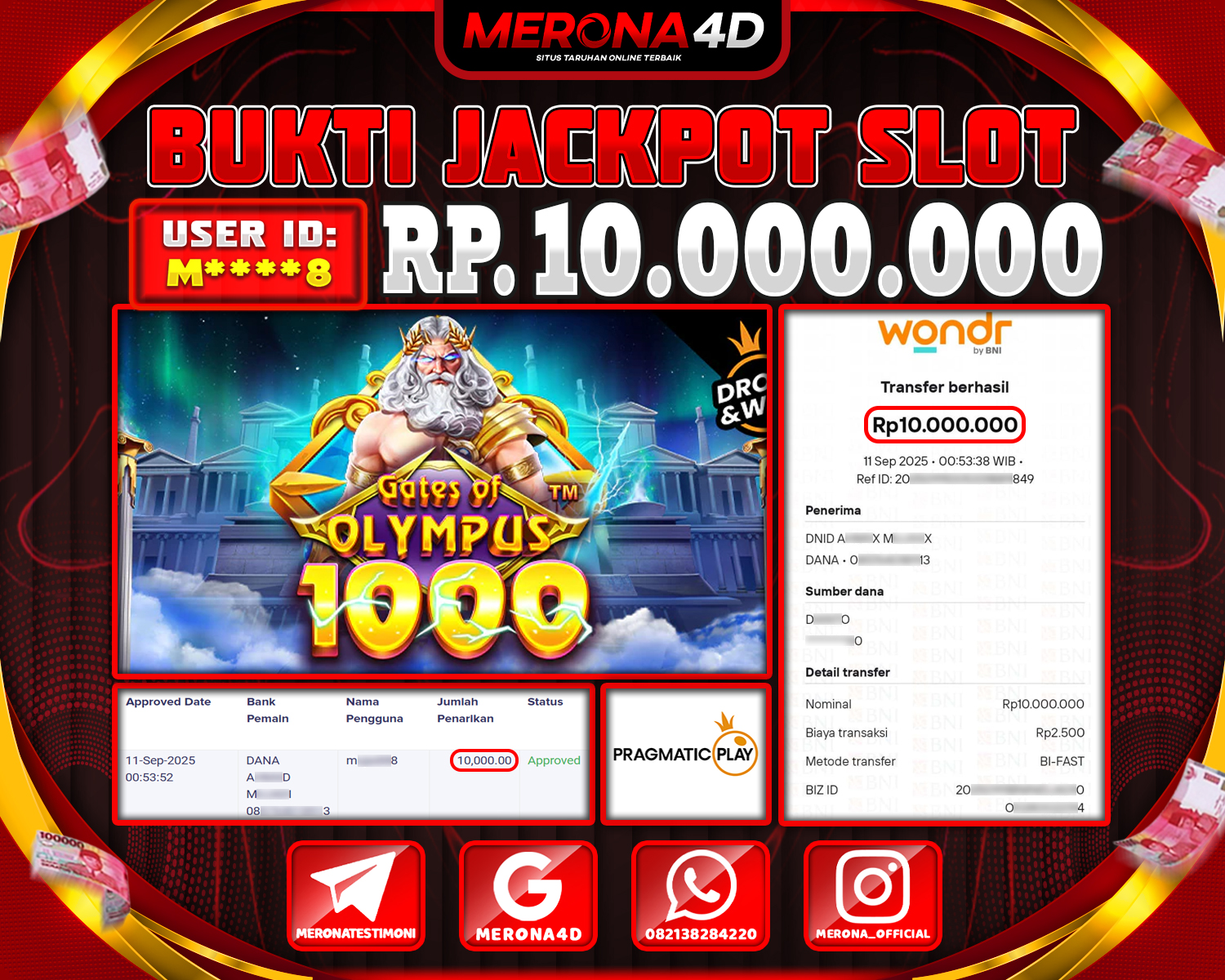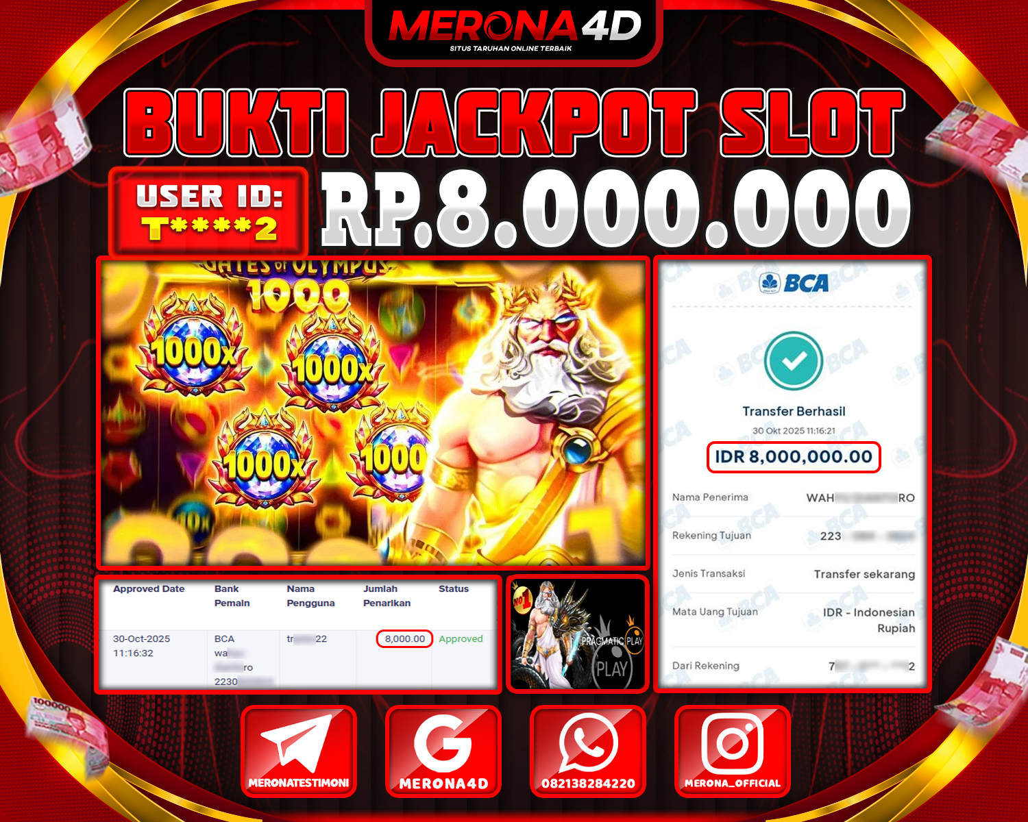 Selamat Kepada Member MERONA4D M****8 Telah Jackpot Di GATES OF OLYMPUS 1000