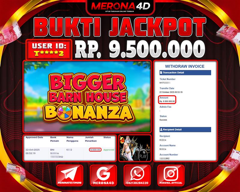 Selamat Kepada Member MERONA4D T*****2 Telah Jackpot Di BIGGER BARN HOUSE BONANZA