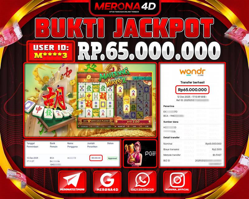 Selamat Kepada Member MERONA4D M*****3 Telah Jackpot Di MAHJONG WAYS 2