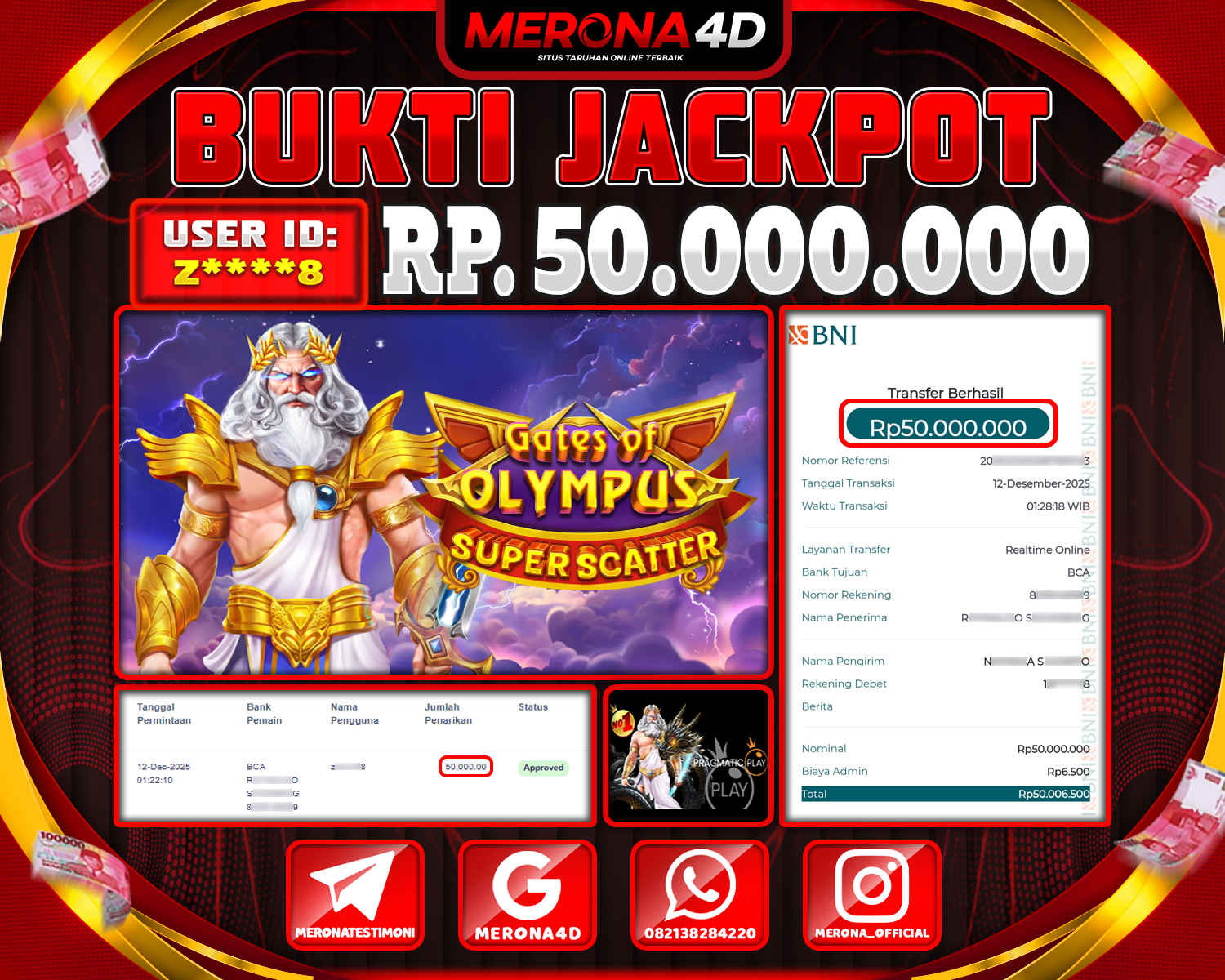 Selamat Kepada Member MERONA4D Z****8 Telah Jackpot Di GATES OF OLYMPUS SUPER SCATTER