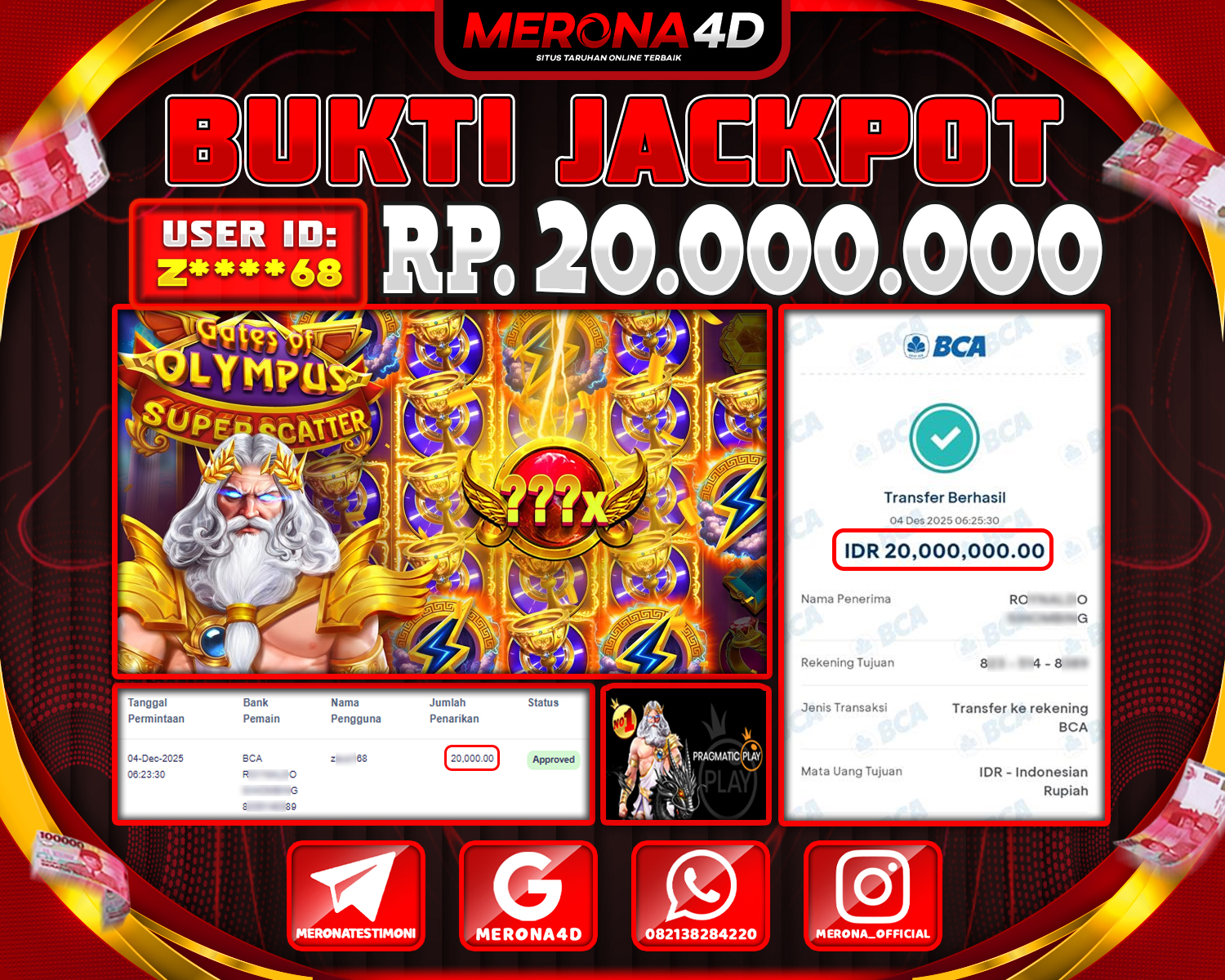 Selamat Kepada Member MERONA4D Z*****68 Telah Jackpot Di GATES OF OLYMPUS SUPER SCATTER