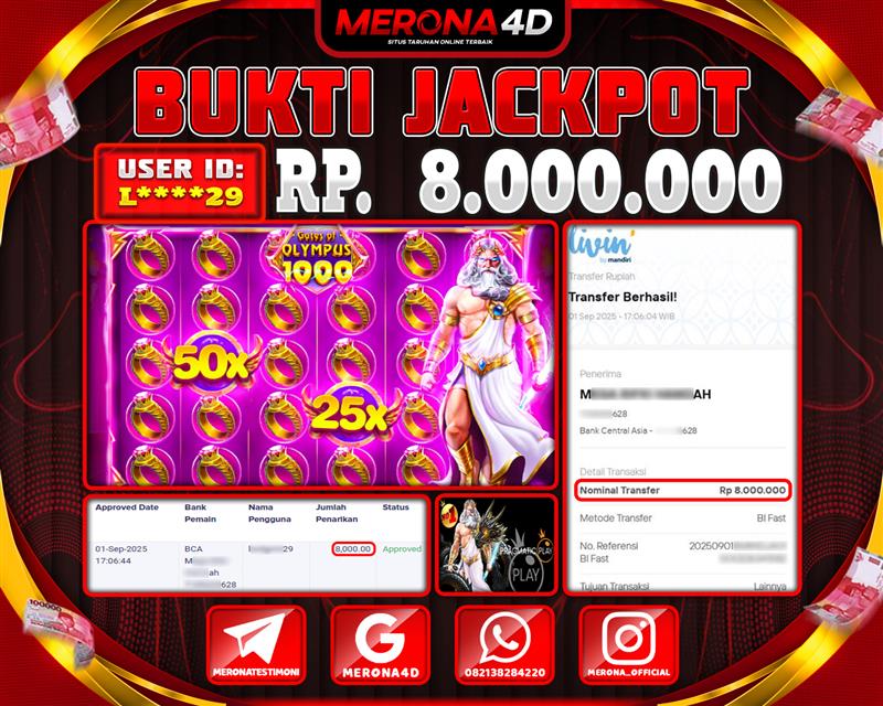 Selamat Kepada Member MERONA4D L*****29 Telah Jackpot Di GATES OF OLYMPUS 1000