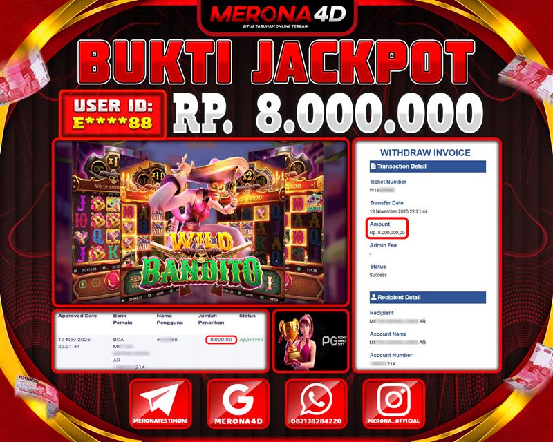 Selamat Kepada Member MERONA4D E*****88 Telah Jackpot Di WILD BANDITO