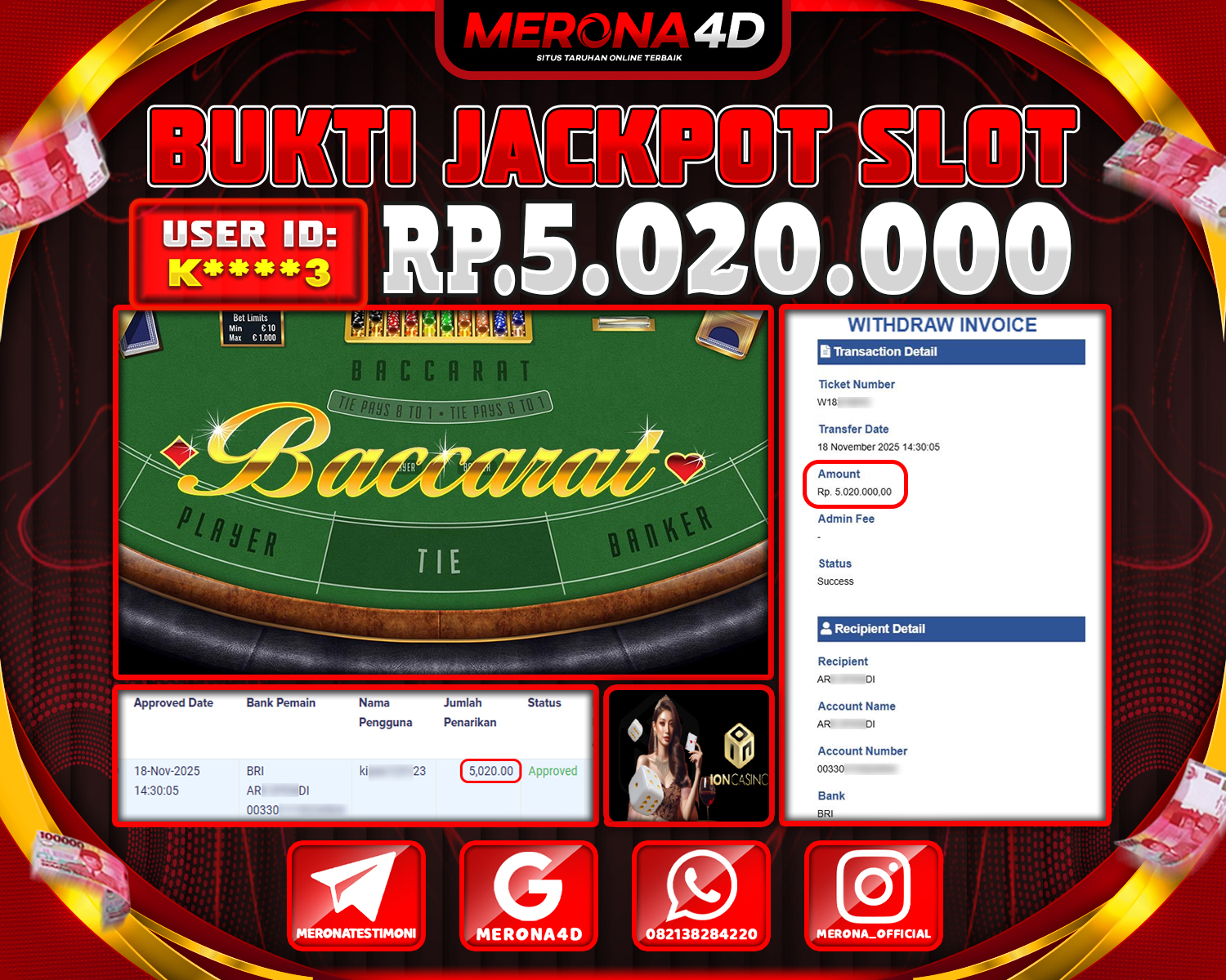 Selamat Kepada Member MERONA4D K*****3 Telah Jackpot Di BACCARAT