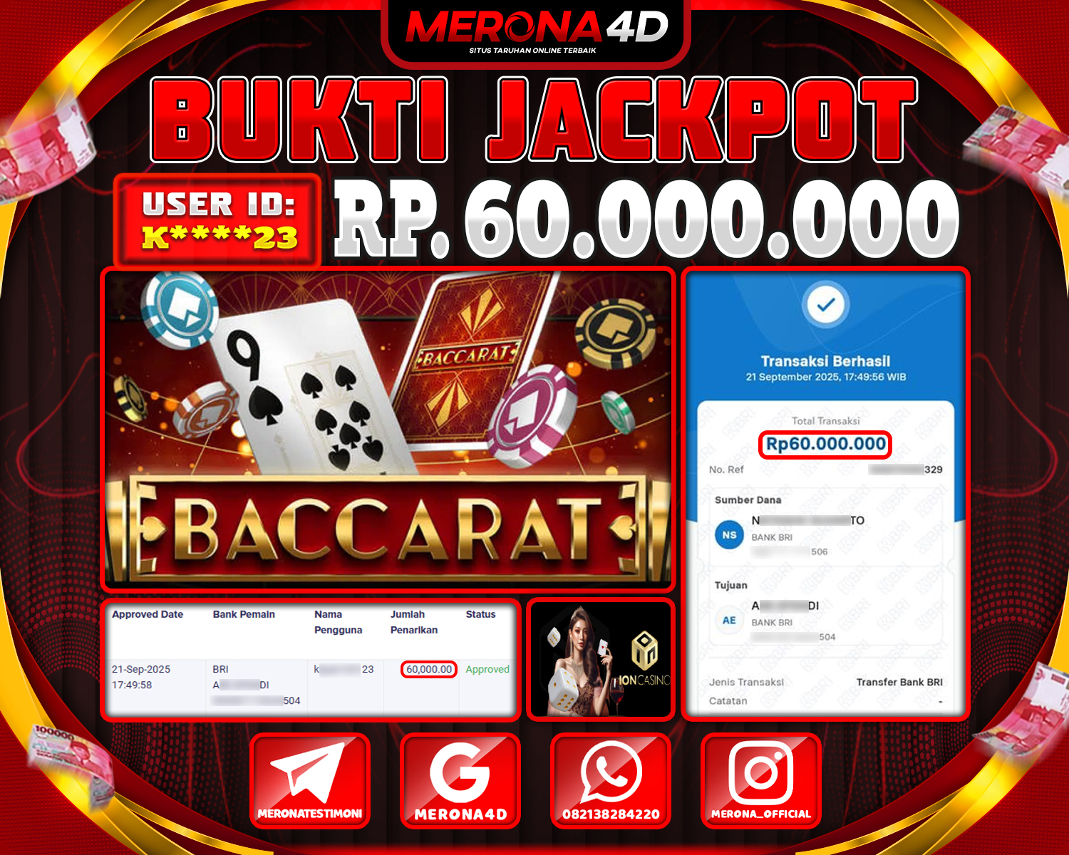 Selamat Kepada Member MERONA4D K*****3 Telah Jackpot Di BACCARAT