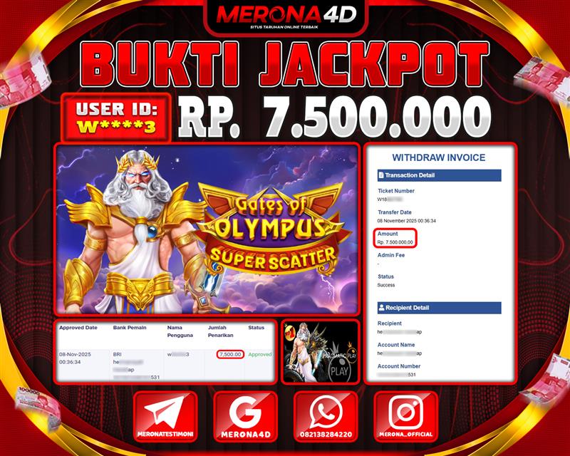 Selamat Kepada Member MERONA4D K****7 Telah Jackpot Di GATES OF OLYMPUS SUPER SCATTER